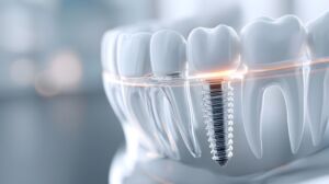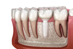 ![]() | 3384 | Detailed 3D render of a single tooth implant, showing the titanium post and ceramic crown within a cross-section of gums and bone. | ||