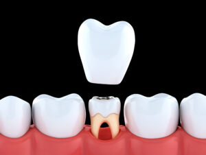 ![]() | 3399 | Dental crown placement on tooth with exposed root and metal filling implant | ||
