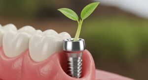 ![]() | 3572 | Dental implant fixture demonstrates biological integration with a vibrant green sprout growing from its abutment | ||